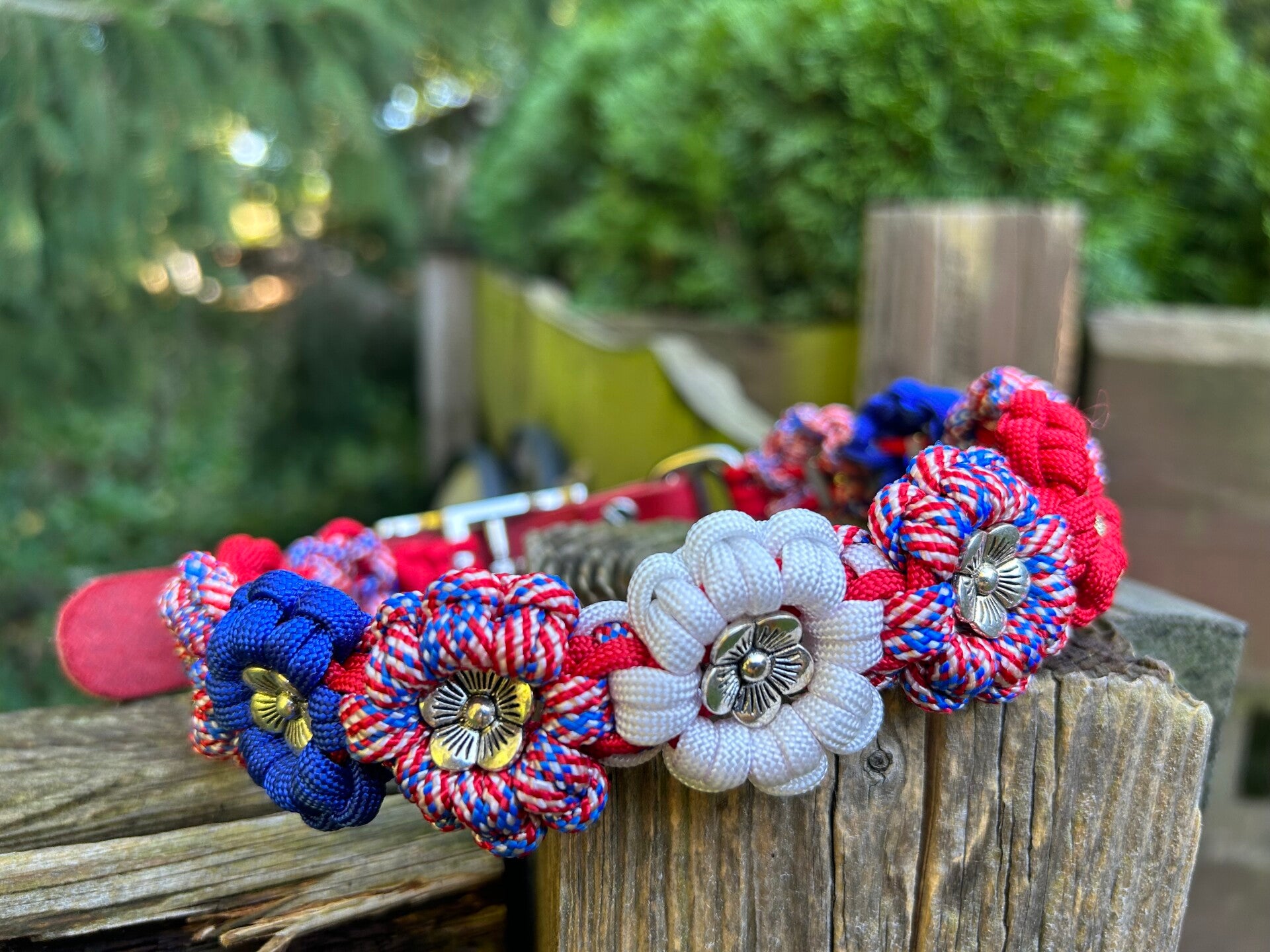 Blümchenhalsband in USA Farben mit roter lederschnalle. Hardware Silber.