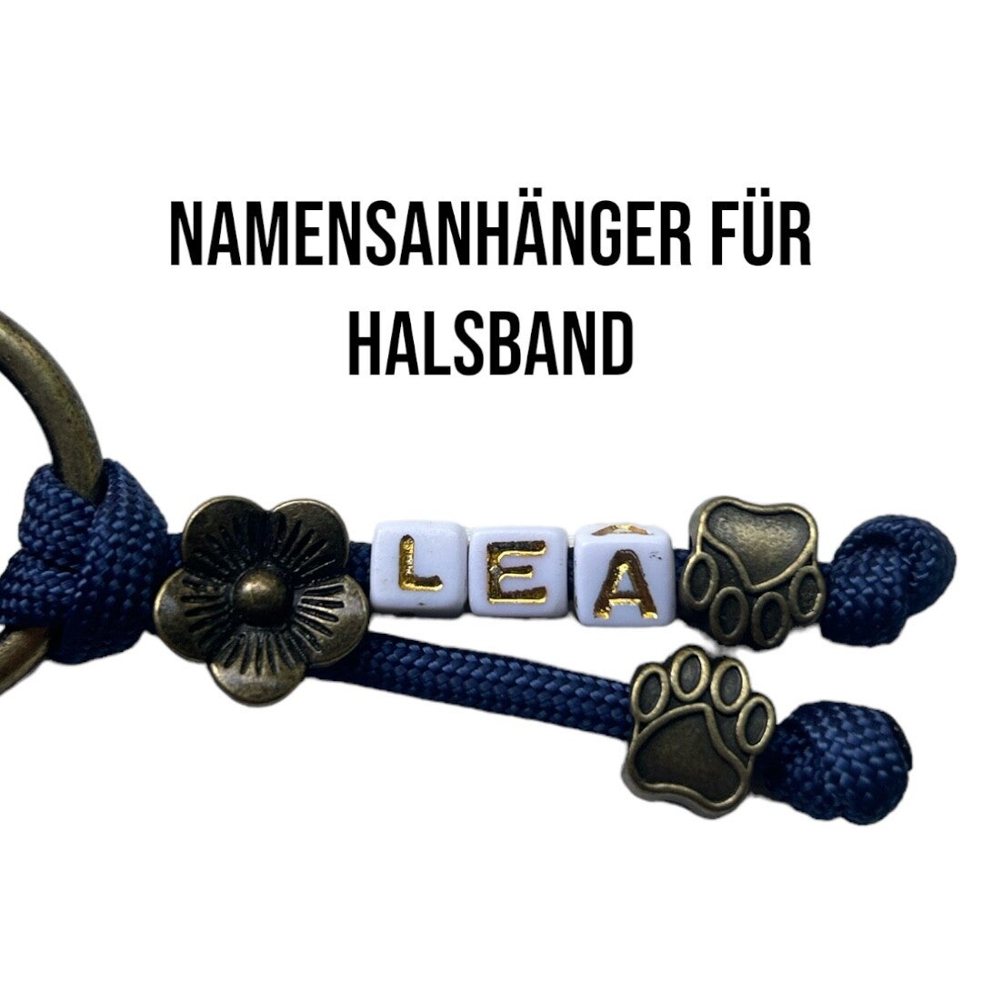 Optional kann das Halsband mit dem Namen/Spitznamen Deiner Fellnase versehen werden. Die Farben der Hardware sind Rosegold, schwarz, antike Bronze oder Silber.