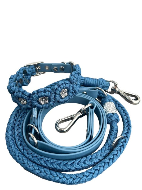 Zum Set gehört das Halsband Modell BLÜMCHEN hier verstellbar von 33-39cm mit verstellbarer Schnalle. Der Karabiner ist unser Farmschön Karabiner. Außerdem wird noch ein silbernes Schmuckelement nach Verfügbarkeit in die Leine eingearbeitet.