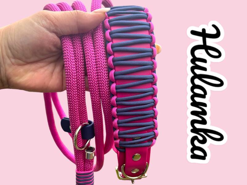 Unser wunderschönes Set bestehend aus Tauleine individuell verstellbar durch verschiebbaren Ring in der Länge ca. 2m sowie einem Halsband in ca. 4cm Breite aus Biothane welches mit Paracord umflochten ist.