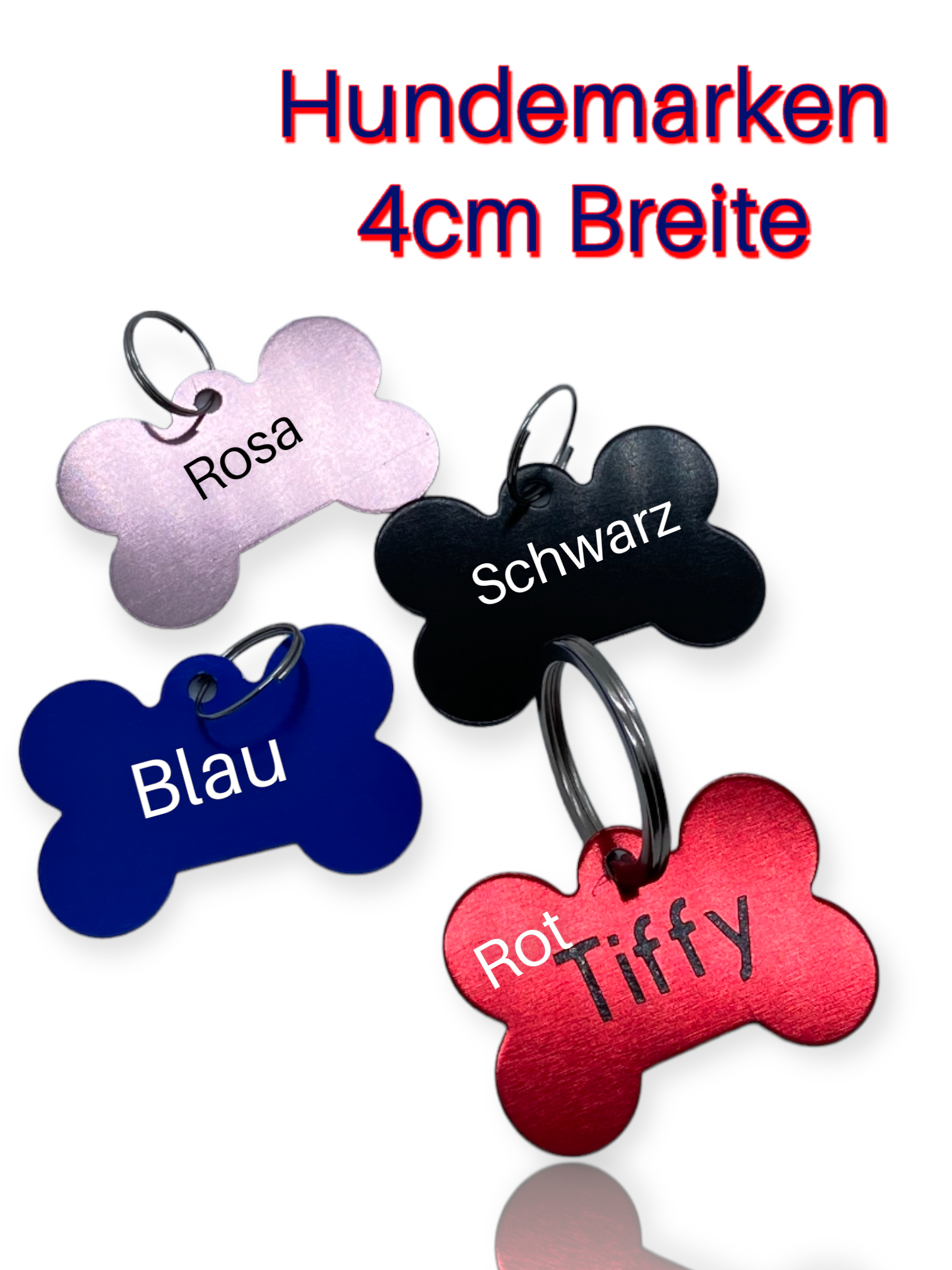 Die Hundemarke ist aus Aluminum eloxiert und kommt in den Maßen 4,0cm x 2,7cm zu Dir.